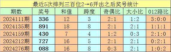1、排列三最近两期百位号码分别开出2和6,历史上百位号码连续两期分别开出2和6的奖号出现了66期。前五期开出之后其下期奖号分别为:336、891、430、727、088;