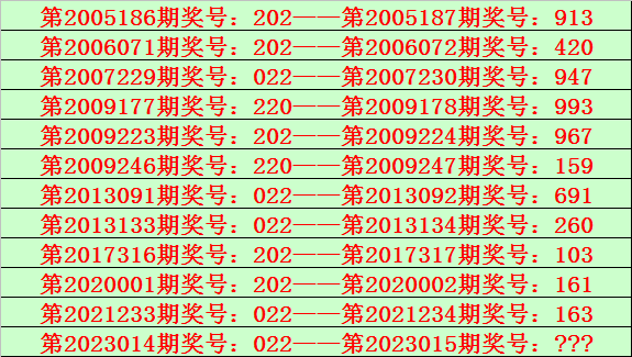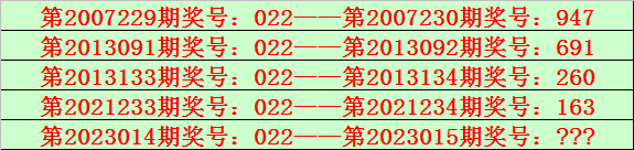 排列三第2023014期开出奖号022,该号码直选类型历史上出现了5次,前4次开出之后期下期奖号为:947、691、260、163,见下表: