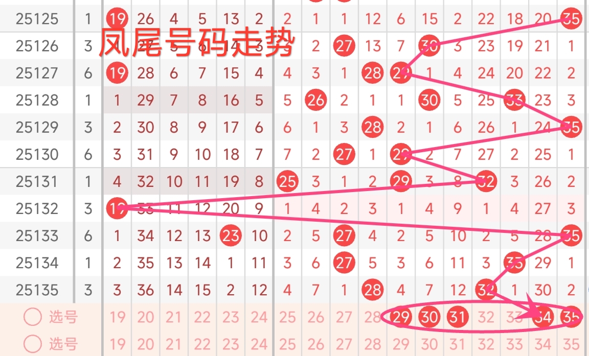 红球三区推荐(25~35):上期红三区开出2枚号码,号码为28、32,本期红三区建议出号1-3枚,本期红三区推荐关注号29、30、31、34、35。