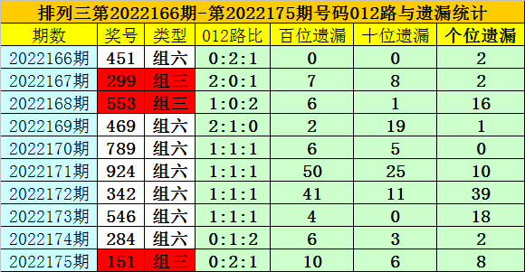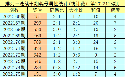 上期回顾:排列三第2022175期奖号:151。类型:组三,奇偶形态:奇奇奇,大小形态:小大小,和值:7,跨度:4。