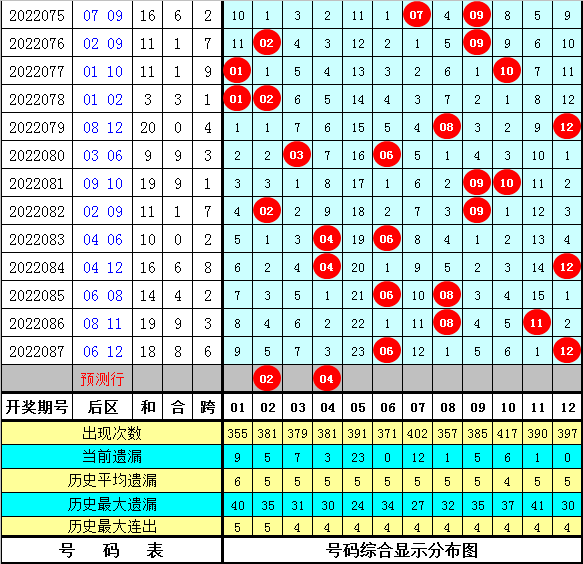 8。在历史同期开奖,后区跨度奇偶比为9:6,其中偶数跨度开出频次较低,本期注意偶数跨度回补。