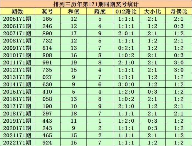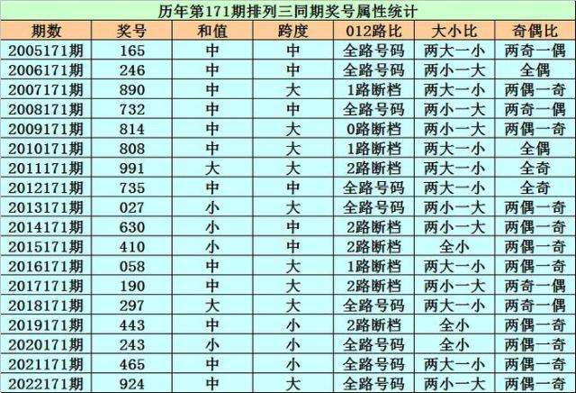 历史上第2023171期排列三已开出18期奖号了,历年同期奖号分别为:165、246、890、732、814、808、991、735、027、630、410、058、190、297、443、243、465、924,详细统计见下表: