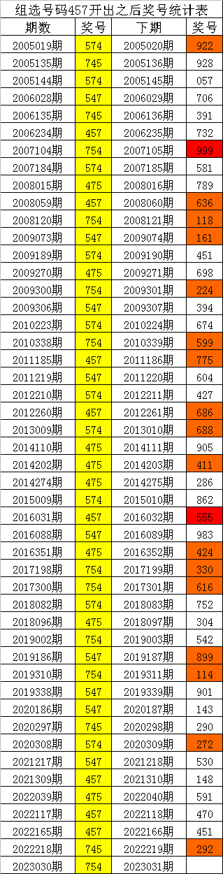 从上表可以看出,组选号码457开出之后,出现次数最多的三个号码分别为:921,本期防这三码中落号;出现次数最少的三个号码分别为:307,本期预计这三个号码不会同时出现,本期杀一码:3。
