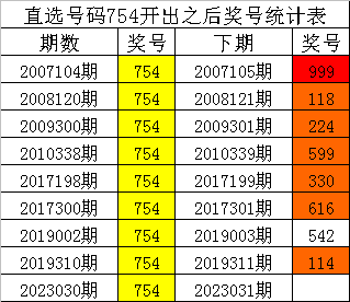 从上表统计可以看出,直选号码754开出之后,其下期奖号: