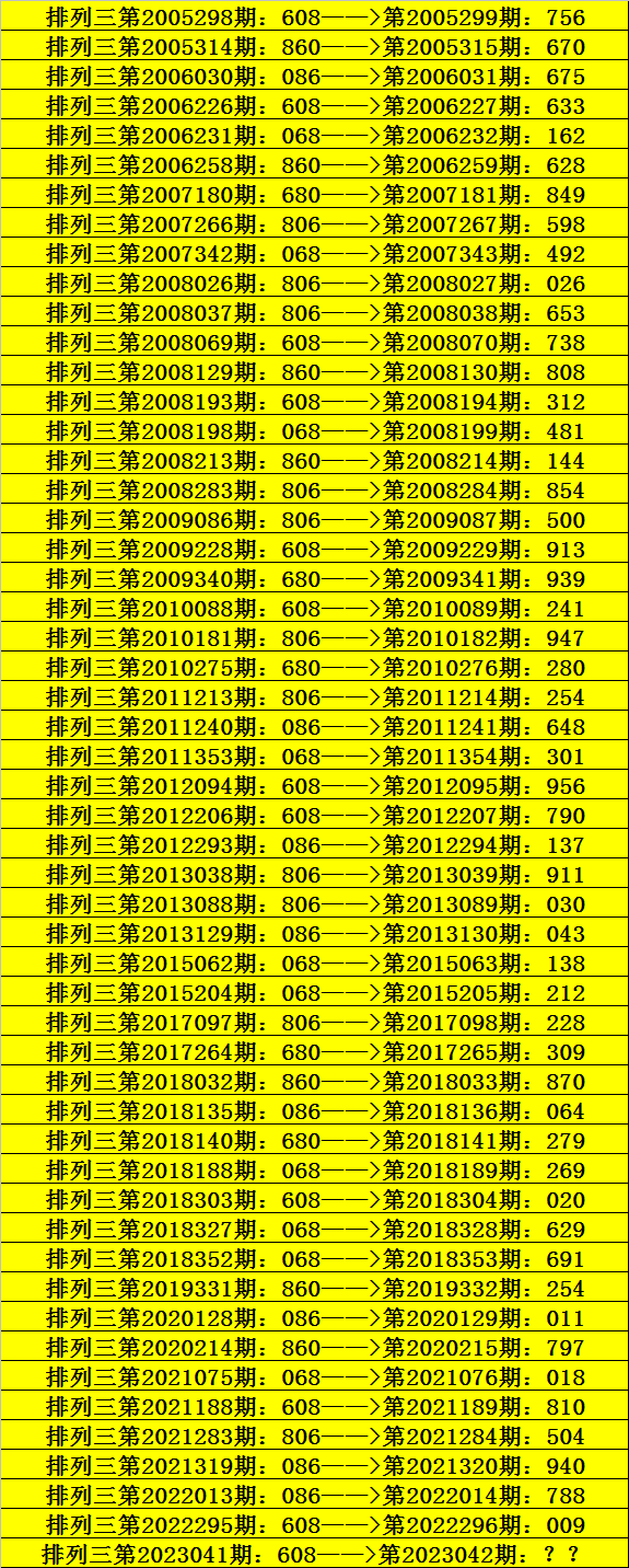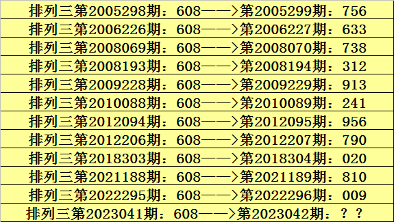 第2023041期排列三奖号为608,历史上该号码直选出现12次,下期奖号分别为:756、633、738、312、913、241、956、790、020、810、009。