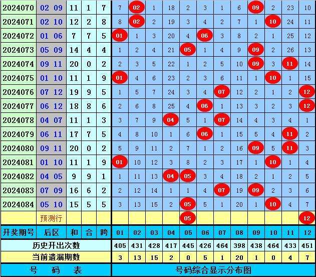 后区分析:上期后区开出奖号05和10,为2路号码和1路号码。最近7期后区012路号码个数比为3:7:4,本期后区看好出现0路号码和2路号码组合,参考两码05、12。