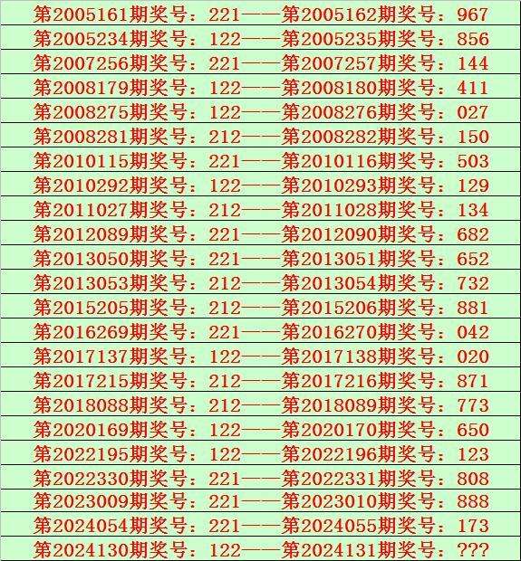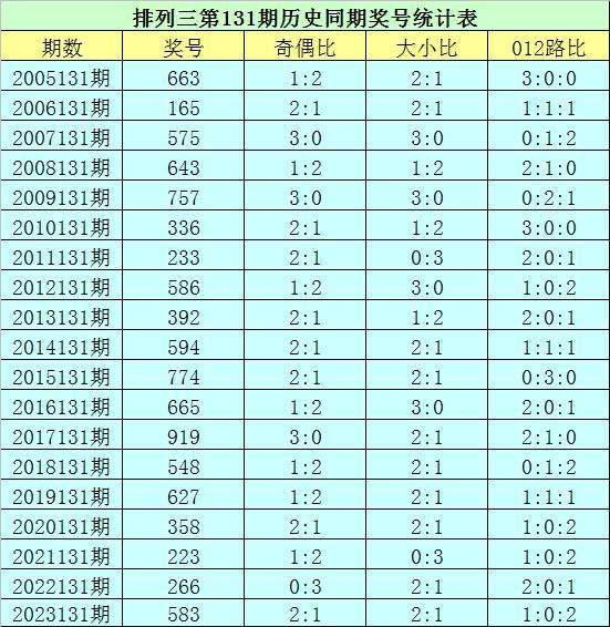 排列三第2024131期开奖日期:2024年5月20日,历史上第131期已开出了19次奖号,历年同期号码分别为:663、165、575、643、757、336、233、586、392、594、774、665、919、548、627、358、223、266、583。