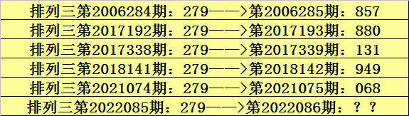 第2022085期排列三奖号为279,历史上该号码直选出现6次,下期奖号分别为:857、880、131、949、068。