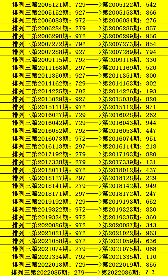 第2022085期排列三奖号为279,历史上该号码组选开出35次,下期奖号分别为:542、866、276、857、956、854、794、330、520、300、302、193、820、971、262、944、447、951、218、880、131、437、229、949、247、652、830、369、343、963、636、068、110、855。