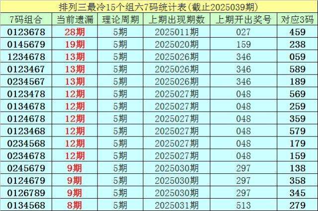 (1)在排列三已开出的7163期奖号中(统计截止第2025039期),目前7码组六遗漏值最大的组合为:0123678,本期遗漏28期;