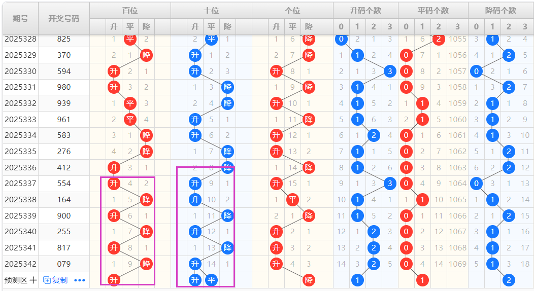 【排列3个位】:近十期升降走势为:升-升-降-升-平-升-升-升,为一种单一加重复性的交错走势,结合走势图可以看出,图中紫色框圈出为一种M形态的出球方式,本期可以重点看好升的形态号码的开出。