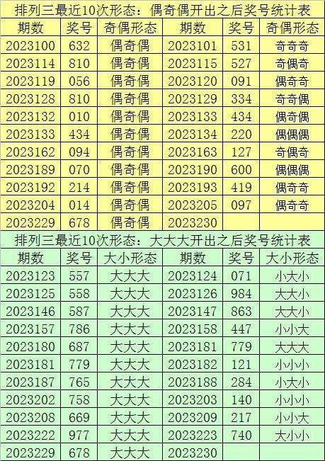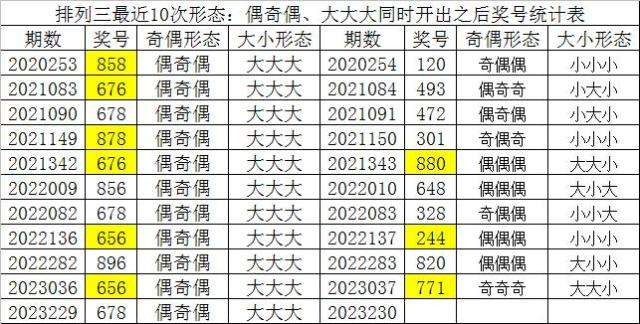 排列三最近10次同时开出奇偶形态:偶奇偶和大小形态:大大大时其奖号分别为:858-676-678-878-676-856-678-656-896-656-678,下期分别开出号码为:120-493-472-301-880-648-328-244-820-771,详细统计见下表: