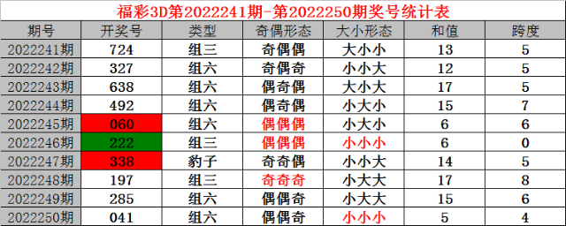 上期回顾:福利彩票3D第2022250期开奖结果041。奖号:偶偶奇、小小小,和值5,跨度4。