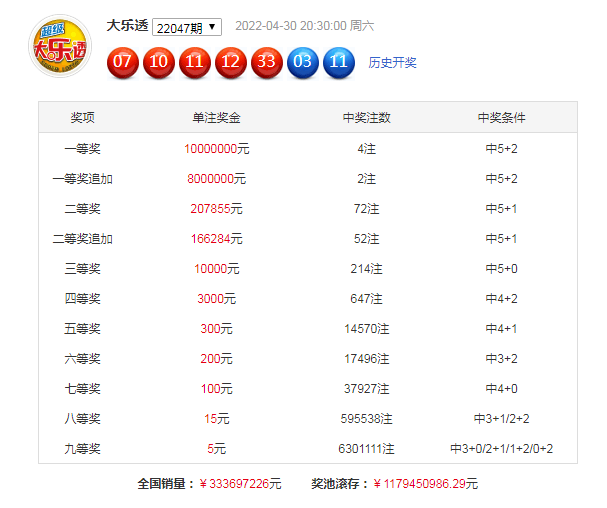 大乐透第2022047期开奖,前区:07、10、11、12、33;后区:03、11。其中前区012路比为2:2:1,后区开出0路号码和2路号码。