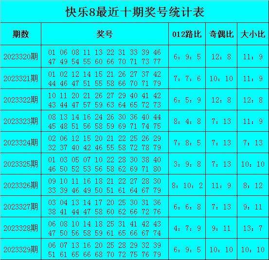 福彩快乐8第2023329期开奖回顾:06 07 13 16 20 25 28 29 32 39 51 61 65 66 68 70 72 75 76 79,其中奖号012路比为6:9:5,1路号码表现活跃。