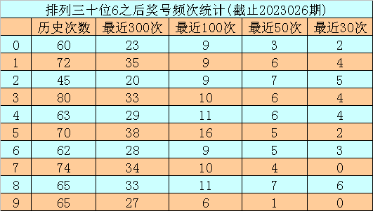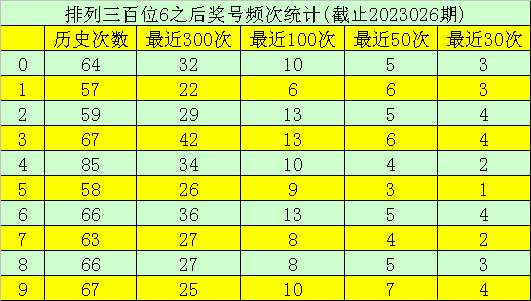 第一位杀号:上期第一位奖号为6,第一位奖号6历史上出现653次,前100次该位开出奖号6之后,下期号码0-9出现次数从高到底分别为:号码3、2、6→13次,0、4、9→10次,5→9次,7、8→8次,1→6次。