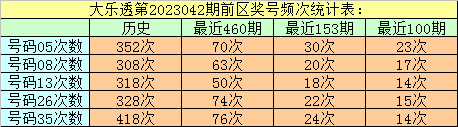 万妙仙大乐透第2023042期前区热号分析:(统计最近460期数据)