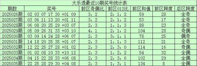 大乐透第2025035期开奖,前区:22、25、28、29、30;后区:04、08。其中前区和值为134,跨度为8,012路比为1:3:1,奇偶比为2:3,后区开出全偶、1路+2路组合。