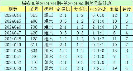 上期回顾:福彩3D第2024053期开奖号码为478,组选类型为组六,奇偶比为1:2,大小比为2:1。
