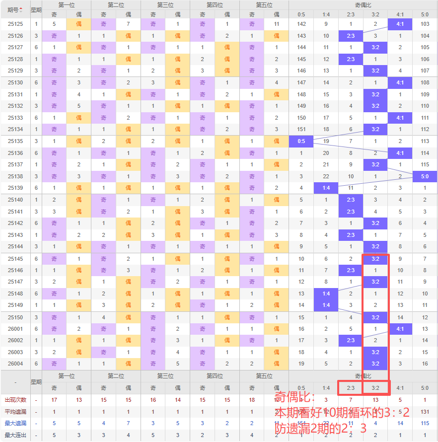 上期奇偶比:3:2,近10期奇偶比出现情况:3:2、2:3、3:2、1:4、1:4、3:2、4:1、2:3、3:2、3:2,最近10期出现5期3:2,出现2期2:3,出现1期4:1,出现2期1:4,出现0期5:0,出现0期0:5,根据近10期规律本期看好10期循环出3:2,防遗漏2期开出的2:3,综上所述推荐奇偶比推荐:2:3,重点关注:3:2。