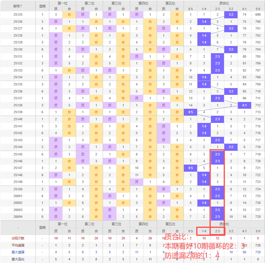 上期质合比:2:3,近10期质合比出现情况:2:3、2:3、0:5、1:4、1:4、2:3、2:3、1:4、2:3、2:3,最近10期出现0期3:2,出现6期2:3,出现0期4:1,出现3期1:4,出现0期5:0,出现1期0:5,根据近10期规律本期看好10期循环的2:3,防遗漏2期出1:4,综上所述推荐质合比推荐:1:4,重点关注:2:3。