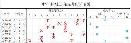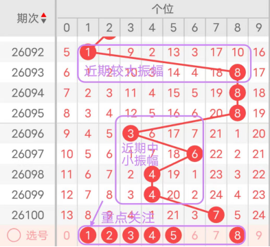 近7期(094~100)开奖号个位号码球分别为8、8、3、6、4、4、7,开奖号与上一期走出的振幅分别为0、0、5、3、2、0、3。094期走出8号大数号码球,走出“0”的小幅度,095期走出8号大数号码球,走出“0”的小幅度,096期走出3号中小数号码球,走出“5”的中大幅度,097期走出6号中大数号码球,走出“3”的中小幅度,098期走出4号中小数号码球,走出“2”的小幅度,099期走出4号中小数号码球,走出“0”的小幅度,100期走出7号大数号码球,走出“3”的中小幅度;从近期振幅大小的走势及大小走势来看,中大振幅走在4~6之间较为适宜,中小振幅走在0~3之间较为适宜;结合走势图的整体及大小走势分析,本期个位应重点关注号码球为1、2、3、4、5、8。