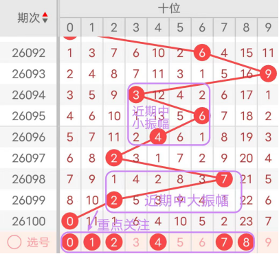近7期(094~100)开奖号十位号码球分别为3、6、4、2、7、2、0,开奖号与上一期走出的振幅分别为6、3、2、2、5、5、2。094期走出3号中小数号码球,走出“6”的中大幅度,095期走出6号中大数号码球,走出“3”的中小幅度,096期走出4号中小数号码球,走出“2”的小幅度,097期走出2号小数号码球,走出“2”的小幅度,098期走出7号大数号码球,走出“5”的中大幅度,099期走出2号小数号码球,走出“5”的中大幅度,100期走出0号小数号码球,走出“2”的小幅度;从振幅大小及走势图的整体对应来看,中大振幅走在7~8之间较为适宜,中小振幅走在0~4之间较为适宜;结合走势图的上下对应及振幅大小分析,本期十位应重点关注号码球为0、1、2、4、7、8。