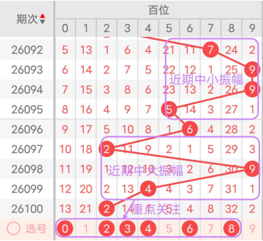近7期(094~100)开奖号百位号码球分别为9、5、6、2、9、4、2,开奖号与上一期走出的振幅分别为0、4、1、4、7、5、2。094期走出9号大数号码球,走出“0”的小幅度,095期走出5号中大数号码球,走出“4”的中小幅度,096期走出6号中大数号码球,走出“1”的小幅度,097期走出9号大数号码球,走出“7”的大幅度,098期走出9号大数号码球,走出“7”的大幅度,099期走出4号中小数号码球,走出“5”的中大幅度,100期走出2号小数号码球,走出“2”的小幅度;从振幅大小及走势图的整体形势来看,中大幅度走在4~6之间较为适宜,中小幅度走在0~2之间较为适宜;结合走势图的整体及大小走势分析,本期百位需重点关注号码球为0、2、3、4、6、8。