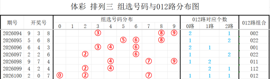 近7期(094~100)开奖号与012路组合分别为938(002)、568(022)、643(001)、226(022)、974(011)、424(112)、207(012),上期开奖号为012路组合,根据整体走势分析,本期看好的012路组合有:001、011、122,防012、002、022路组合。