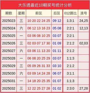 开奖回顾:大乐透2025032开奖号码为12、22、25、27、28+01、02。其中012路比为2:3:0、开出1组连号27,28。