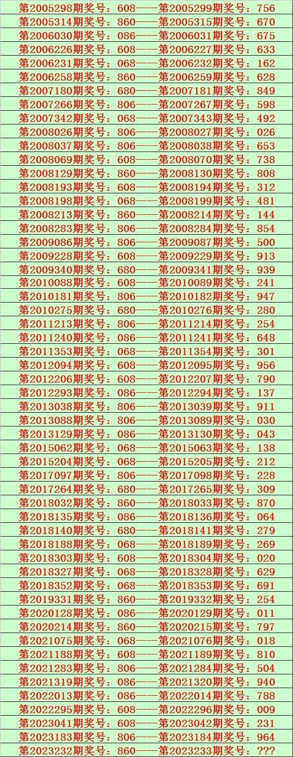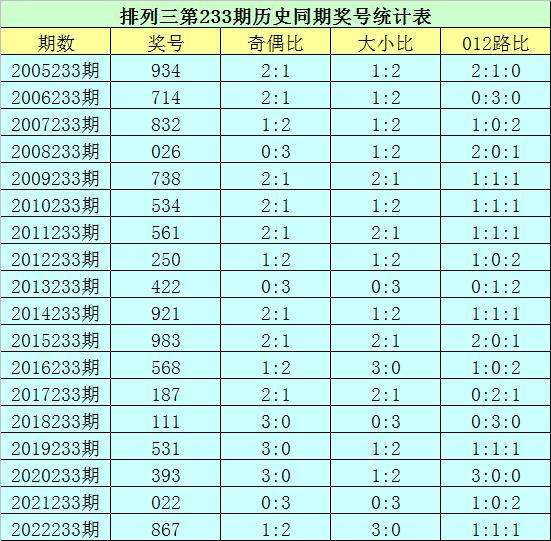 排列三第2023233期开奖日期:2023年8月31日,历史上第233期已开出了18次奖号,历年同期号码分别为:934、714、832、026、738、534、561、250、422、921、983、568、187、111、531、393、022、867。