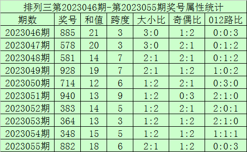 上期回顾:排列三第2023055期开奖号:882,奖号和值:18,奇偶比1:2,大小比2:1。