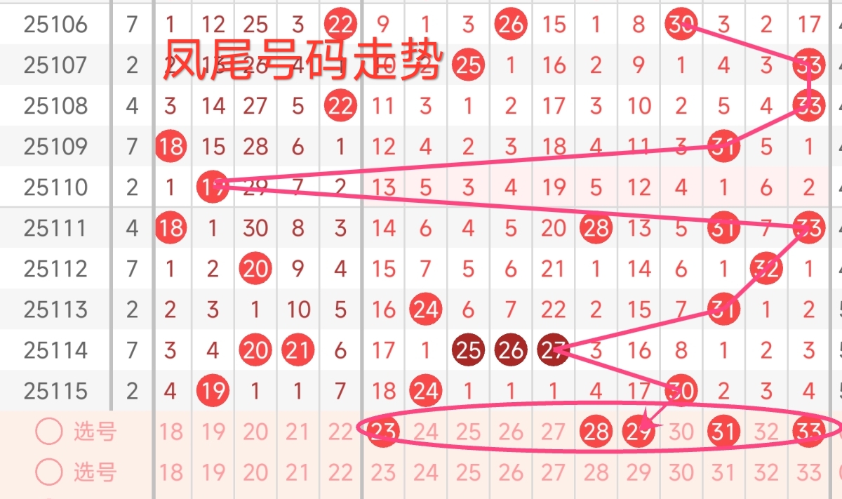 上期凤尾号码为30,振幅上升了3点,开出了偶数号码。回顾近期凤尾号码,振幅波动较大。上期凤尾号码为 30,处于红三区的高位。近期凤尾号码在红三区的高位和中位徘徊。预计本期凤尾号码会继续在红三区之间波动,预计本期凤尾号码看好 23-33区间。本期还需注意一些连续漏出的号码有望在本期热出。本期凤尾号码可重点关注23、28、29、31、33。