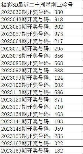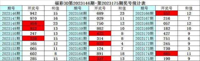 上期回顾:福彩3D第2023175期奖号为:190,其中奖号组选类型为:组六,奇偶比为2:1,大小比为1:2,012路比为2:1:0,和值为10,跨度为9。