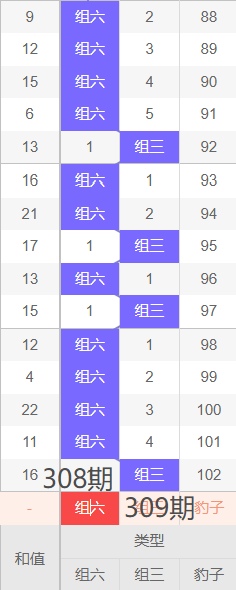 上期形态:组三,近10期的形态分别为:组六,组六,组三,组六,组三,组六,组六,组六,组六,组三,近期组三和组六的形态比较规律性,根据以往形态规律,本期个人认为需要重点关注组六落位,同时也需要防组三形态的开出。