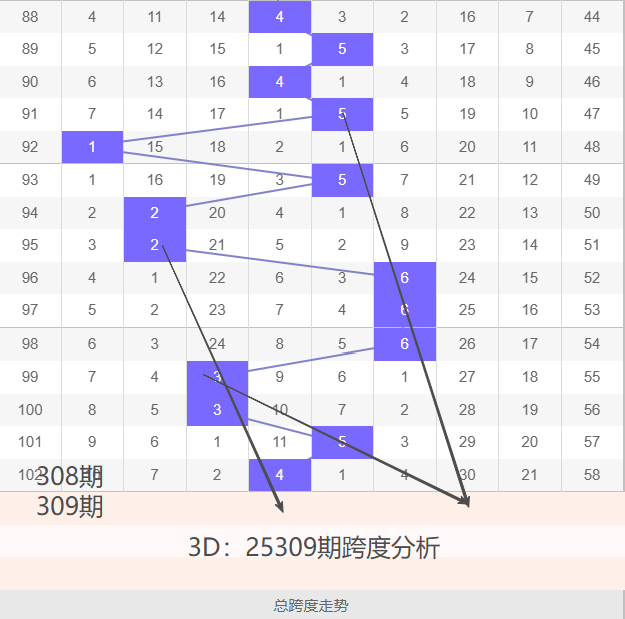 近3期跨度变化不大,上期振幅1,近期10期跨度分别为:5跨,2跨,2跨,6跨,6跨,6跨,3跨,3跨,5跨,4跨,小跨度近期有开始走强的趋势,跨度目前整体是明显的开始偏向于大跨度的,本期个人预期跨度是可能走向大跨度,可参考:2跨 ,1 跨,7跨,同时防 :6跨,8跨,9跨,