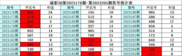上期回顾:福彩3D第2023205期奖号为:171,其中奖号组选类型为:组三,奇偶比为3:0,大小比为1:2,012路比为0:3:0,和值为9,跨度为6。