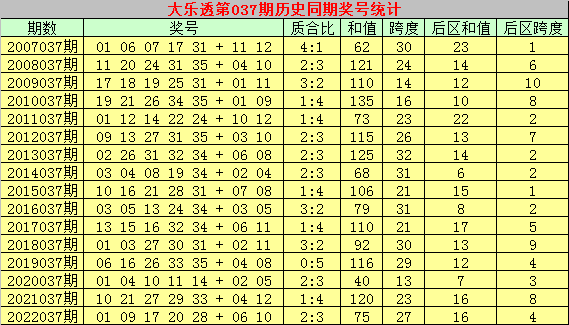 后区分析:在第037期历史同期开奖中,后区和值分别开出23、14、12、10、22、13、14、6、15、8、17、13、12、7、16、16,本期看好后区开出偶数和值,参考和值6。