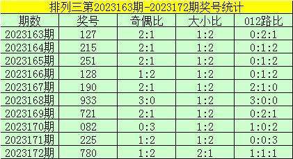 排列三最近十期分别开出奖号:780、225、082、721、933、190、128、251、215、127,其中号码奇偶比为16:14,奇偶号码基本持平;号码大小比为11:19,大号表现较冷;号码012路比为7:9:14,2路号码走热。
