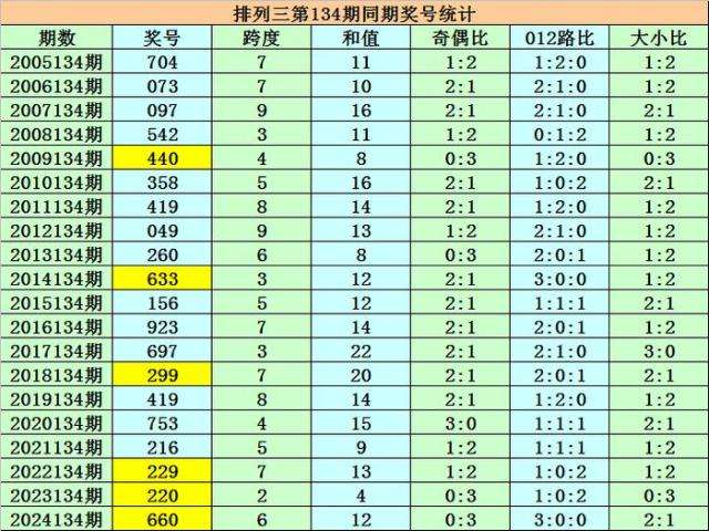 上期回顾:排列三第2024134期奖号为660,组选类型为组三,奖号大小比为2:1,012路比为3:0:0,奇偶比为0:3。