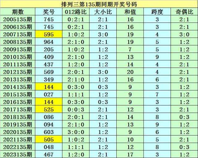本期为排列三第2024135期开奖,开奖日期为:2024年5月24日,历史上排列三第135期已开出了19次奖号,历年同期开出号码分别为:745-745-595-964-205-409-437-569-349-144-027-144-525-086-094-603-505-048-467。