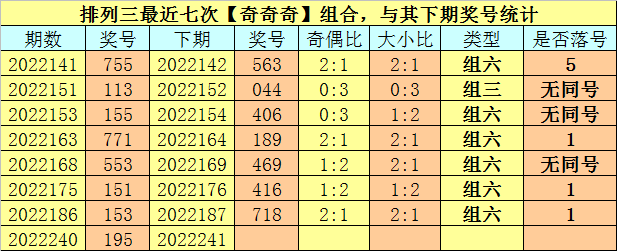 奖号类型分析:排列三最近七次【小大大】组合与【奇奇奇】组合出现之后,其下期豹子号码开出1次,组三号码开出2次,组六号码开出11次,其中组六号码开出频率非常热,本期预计继续开出组六号码。另外,其下期有5期没有出现重号,本期不看好开出重号。