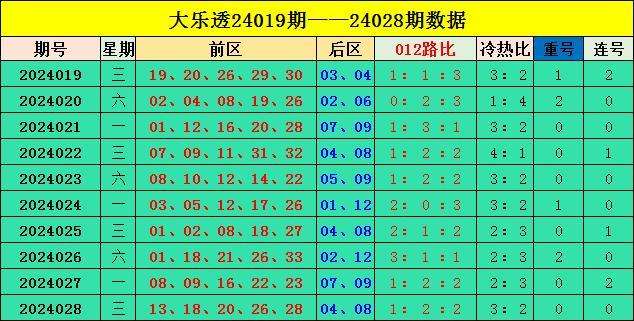 当期前区号码012路比为1:2:2,冷热比为3:2,包含0个重号,0组连码组合,后区开出小大组合04 08。