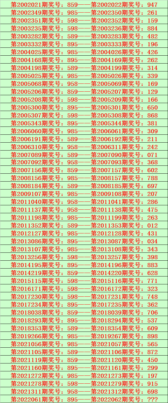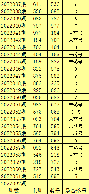 福彩3D第2022062期开奖日期:2022年3月13日,历史上第062期已开出了20次奖号,历年同期号码分别为:341、699、041、311、708、775、933、443、513、160、023、669、300、827、803、975、792、408、902、130。
