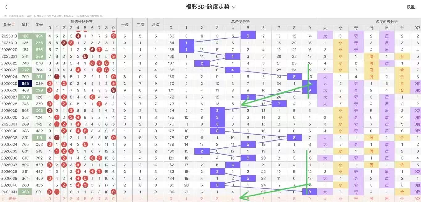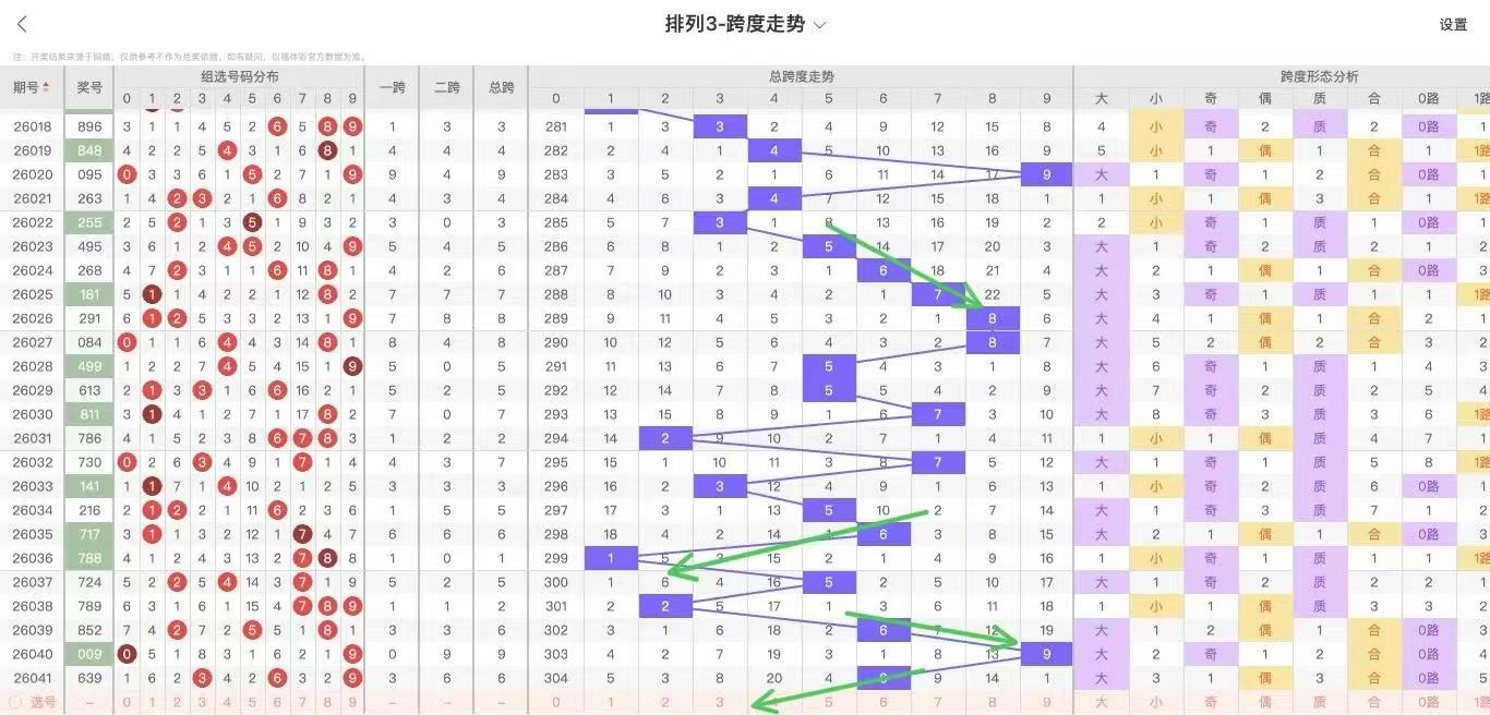 10期内跨度走势为:7-3-5-6-1-5-2-6-9-6,10期内大小跨比为7:3,奇偶跨比6:4,百期内跨度6共开出15次,下期数据:6 6 9 3 8 7 8 4 8 7 9 7 1 9 近期较热,考虑跨度6开出后容易出大跨度,近期大小规律下小:奇:质,所以接下来继续小跨,偶跨度表现!