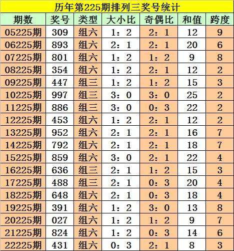 历年第225期奖号中:组三开出5次,组六开出13次。组三较少,本期注意组三反弹。