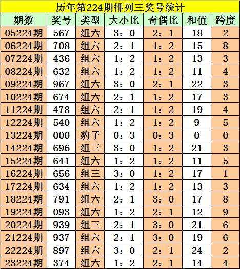 排列三第2023224期奖号:374,和值14,跨度4,大小比1:2,奇偶比2:1。