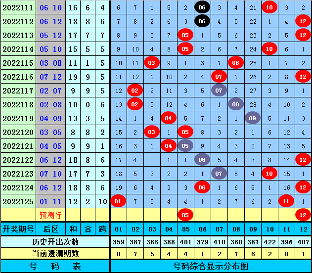 后区分析:最近30期后区奖号012路比为21:20:19,最近10期后区奖号012路比为7:7:6,上期后区为1路+2路组合01和11,本期后区参考号码01、05、06、08、12,看好开出0路号码和2路号码,两码关注05、12。