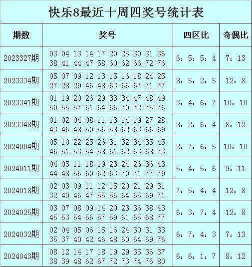 福彩快乐8第2024043期(上周四)开奖回顾:08 12 14 17 18 19 29 35 36 37 38 39 48 62 67 72 73 74 76 80,其中奖号四区比为6:6:1:7奇偶比为8:12。