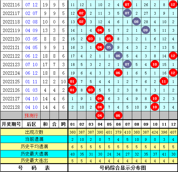 彤彤第2022129期体彩大乐透后区遗漏分析:(定义:后区遗漏0-3期号码为热码,遗漏4-9期号码为温码,遗漏9期的号码以上为冷码)